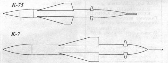 Наибольшей преемственностью в сравнении с К-5 обладала ракета K-7J1 – вариант с системой наведения по лучу РЛС "Алмаз-3". Как и для большинства ракет, заданных Постановлением 1954 г., для К-7 предусматривалось достижение максимальной дальности до 9… 12 км. Для обеспечения приемлемой эффективности при наведении по лучу самолетной РЛС, ракету оснастили боевой частью, втрое более тяжелой по сравнению с примененной на К-5. Наряду с необходимостью обеспечить большую дальность, это решение обусловило и вдвое больший стартовый вес новой ракеты, а также примерно полуторакратное увеличение длины. Как и на К-5, в носовой части К-7Л размещались радиовзрыватель и боевая часть, а в хвостовой – аппаратура радиоуправления с антенным устройством, что потребовало применения двигателя в двухсопло- вом исполнении. Однако, в отличие от первой серийной советской ракеты "воздух – воздух", К-7Л была выполнена по нормальной аэродинамической схеме, так что рули с приводом и элементами автопилота располагались позади двигателя.