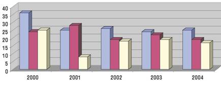 2000 2001 2002 2003 2004 Всего запусков 36 25 26** 24 25 Запущено КА (в т.ч. российских) 49 (24) 36 (28) 37 (19) 41 (22) 36 (19) в т.ч.: КК «Союз-ТМ, ТМА» 2 2 2 2 2 КК «Прогресс-М, М1» 5 6 3 3 4 Запущено РН 36 25 25 24 25 в т.ч.: «Союз-У, ФГ» (11А511У, 11А511У-ФГ) 13 9 6+1* 8 7 «Протон-К, М» (8К82К, 8К82КМ) 14 6 9 5 8 «Космос-3М» (11К65М) 2+1* 1 4 3 2 «Зенит-2» (11К77) 2 1 - - 1 «Зенит-3SL» 2+1* 2 1 3 3 «Молния-М» (8К78М) - 2 2 2 1 «Циклон-2» (11К69) - 1 - - 1 «Циклон-3» (11К68) 1* 2 - - 1 «Старт-1» 1 1 - - - «Днепр-1» (15А18) 1 - 1 - 1 «Рокот» (14А05) 1 - 2 2 - «Стрела» - - - 1 - «Союз-2» (14А14) - - - - 1*** Количество запусков с космодромов: Байконур 30 16 16 14 17 Плесецк 3+2* 6 8+1* 7 5 Свободный 1 1 - - - Капустин Яр - - - - - Плавучая платформа «Одиссей» 2+1* 2 1 3 3 Количество аварийных запусков 3 - 1 - - Количество запусков РН «Атлас» (США) с российскими ЖРД РД-180 1 - 2 4 1* аварийные запуски