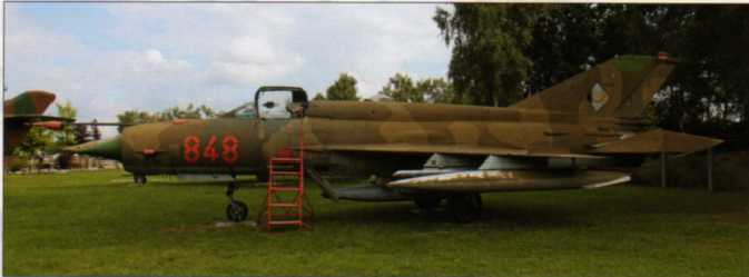 Еще один МиГ-21БИС с бортовым номером 848 тоже вызвал вопрос. В музее представлена машина с подвесным контейнером СПС-141, хотя БИСы не могли использовать контейнеры этого типа. По всей видимости, во время очередного показа техники высшему руководству на этот МиГ подвесили СПС-141, но по каким-то причинам не сняли, и машина так и попала в музей с этим «подвесом».