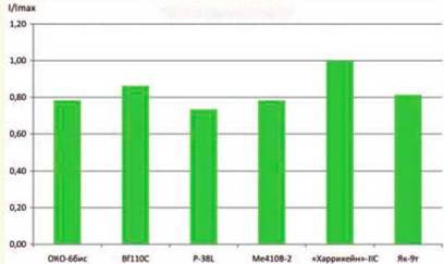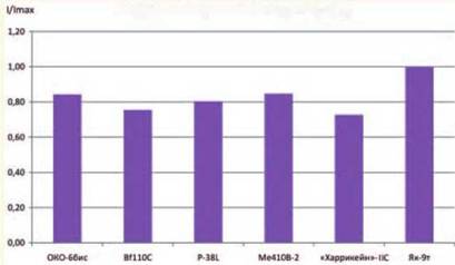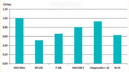 По располагаемой продольной перегрузке ОКО- 6бис проигрывал только «танковому» Як-9т (на 11 %), опережая все остальные сравниваемые самолеты на 10–20 %.