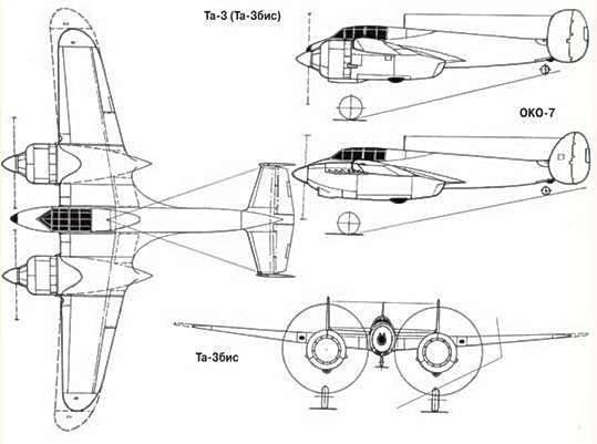 При переделке ОКО-6 в Та-3 на самолете по образцу ОКО- 6бис удлинили хвостовую часть фюзеляжа. Изменили конфигурацию вертикального оперения и увеличили его площадь. Изменили соотношение площадей горизонтального и вертикального оперений, рулей высоты и направления. Установили редукторные моторы М-89 левого вращения (1150/1300 л.с.) с винтами АВ-5л-125 диаметром 3,0 м. Вес топлива в фюзеляжном и центропланных бензобаках довели до 835 кг, масла — до 80 кг. Усилили шасси из расчета посадочного веса самолета 6600 кг. В этой связи использовали колеса еще более увеличенных размеров. Переделали створки основных стоек шасси — в убранном положении колеса стали немного выступать наружу. Предусмотрели заполнение бензобаков нейтральным газом. Все бензобаки имели протектор. Вооружение, как и прежде, состояло из четырех пушек ШВАК (800 снарядов) и двух пулеметов ШКАС (800 патронов). Обеспечивалась возможность подвески бомб типа ФАБ-500 и ФАБ-250, а также установки четырех ракетных орудий РО-82. На самолете были устранены все выявленные в ходе заводских испытаний дефекты и недостатки.
