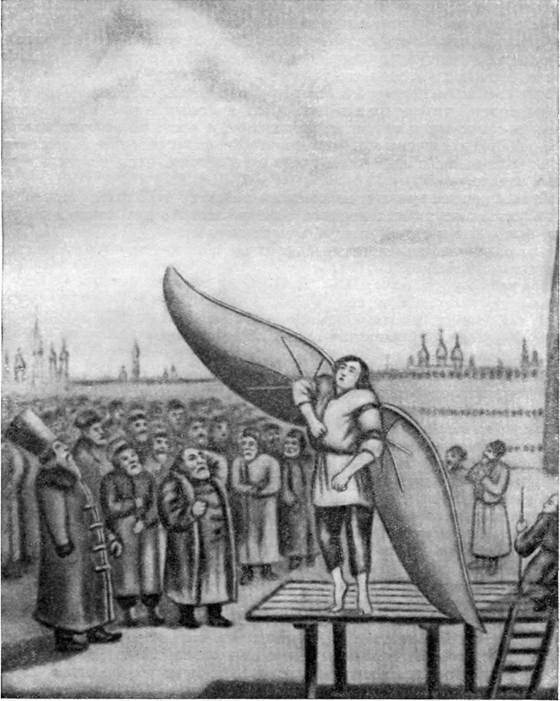 «Тогожь месяца апреля в 30 день закричал мужик караул и сказал за собой Государево слово и приведен в Стрелецкий приказ и расспрашиван, а в расспросе сказал, что он, сделав крыле, станет летать, аки журавль. И по указу Великих Государей сделал себе крыле слюдяные, а стали те крыле в восемнадцать рублев из государевой казны. И боярин Иван Борисов Троекуров с товарищи и с иными прочими, вышед, стал смотреть; и тот мужик те крыле устроя, по своей обыкности перекрестился и стал мехи надымать и хотел лететь, да не поднялся и сказал, что он те крыле сделал тяжелы. И боярин на него кручинился, и тот мужик бил челом, чтоб ему сделать другие крыле иршеные, и на тех не полетел, а другие крыле стали в пять рублев. И за то ему учинено наказание: бит батоги снем рубашку, и те деньги велено доправить на нем и продать животы его и остатки».
