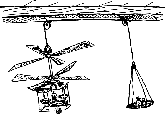 Этот вывод приводит Можайского к убеждению, что летательный аппарат построить можно. Изучая судовую паровую машину и гребной винт, Можайский пришел к мысли, что винт, быстро вращающийся в воздухе, врезаясь в воздух, найдет в нем опору и будет работать подобно гребному винту.