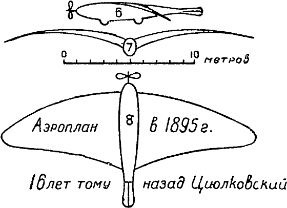 Однако Циолковский ищет и реального способа передвижения по воздуху. Твердо веруя в свой дирижабль, он на некоторое время увлекается и идеей аэроплана, публикуя в 1895 году свое замечательное сочинение: «Аэроплан, или птицеподобная летательная машина», где дает чертежи и расчет самолета, удивительно приближающегося к современному типу. А через три года, в 1898 году, Циолковский выводит формулы теории ракетного движения и таким образом располагает, хотя бы и в плане теоретическом, возможностью решить вопрос о наиболее реальном средстве для межпланетных сообщений.