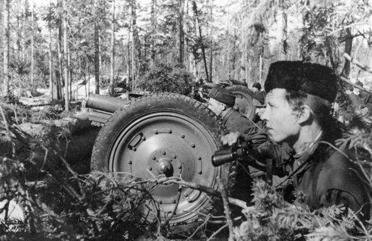 Взвод 76-миллиметровых полковых пушек изготовился для ведения стрельбы с закрытой позиции.