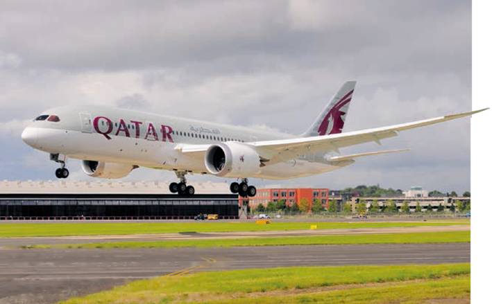 Boeing 787-8 авиакомпании Qatar Airways во время его презентации на авиасалоне в Фарнборо, июль 2012 г. В течение прошлого года перевозчик получил первые пять из 30 заказанных «дримлайнеров»