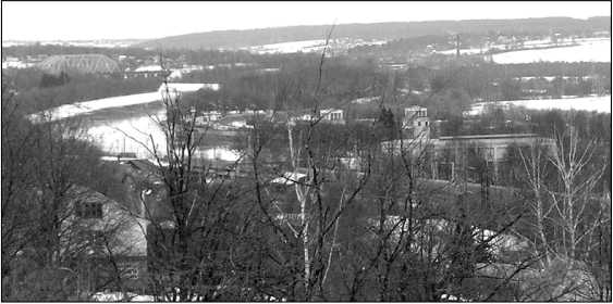 Современный вид с Перемиловских высот на канал. Справа внизу – строения шлюза № 3. В левом верхнем углу – железнодорожный мост. По полям, которые видны перед лесом на заднем плане, 44-я сбр двинулась на штурм д. Степаново.