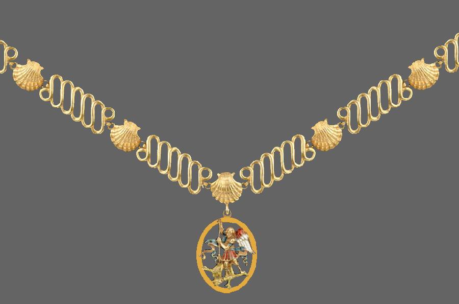 На ордене изображён архангел Михаил на скале, символизирующей штаб-квартиру ордена – священную гору Мон-Сен-Мишель