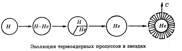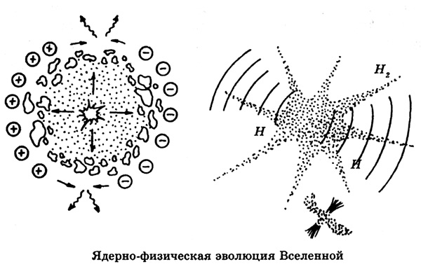 Изучение законов термоядерного синтеза принесло астрономам множество больших и малых открытий, касающихся не только звезд. Сегодня почти все космологические представления так или иначе затрагивают ядерно-физическую эволюцию мироздания. Сама Вселенная родилась в результате чудовищной силы взрыва мельчайшей частицы с поперечником 1031 см. Внутри этой частицы пребывала вся мировая материя, сжатая до плотности 1095 г/см3.