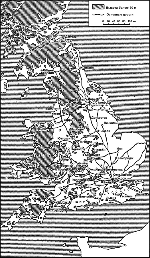 Вначале королевские войска опирались на западные и центральные графства Англии, а сторонники парламента – на Лондон (см. рис. 3). Первое роялистское наступление на Лондон закончилось позорным крахом при Тернем-Грине, который часто называют английским Вальми времен гражданской войны. Это было бескровное поражение, явившееся моральным следствием кровавого, но окончившегося безрезультатно сражения главных сил обеих армий у Эджхилла, имевшего место в начале наступления.