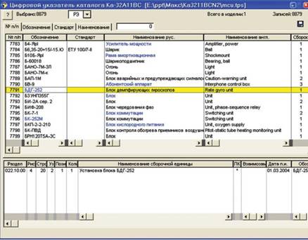 Предположим, нас интересует информация о блоке демпфирующих гироскопов БДГ-252 вертолета Ка-32А11ВС. Находим изделие по цифровому указателю каталога. Место установки блока на вертолете приведено в адресе на иллюстрации. Если информация об изделии имеется в Руководстве по эксплуатации, то на инструментальной панели указателя появляется кнопка «РЭ», а обозначение изделия выделяется определенным цветом в поле «Обозначение».