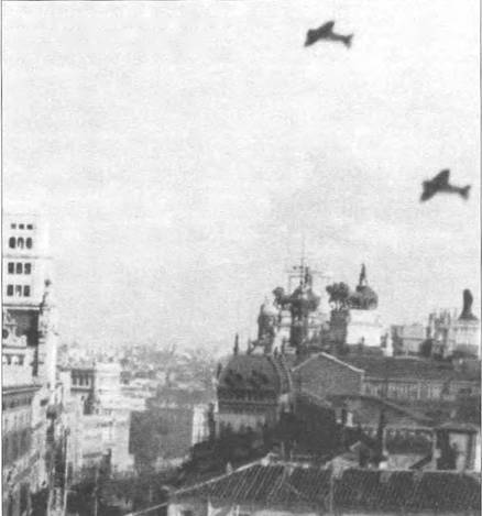 Конечно, эти одномоторные самолеты с максимальной бомбовой нагрузкой в 200 кг (дюжина 12-15 кг бомб) не могли нанести большому городу серьезного ущерба, но наряду с ними продолжали действовать экипажи трехмоторных Ju52 и SM.81 наносивших удары 250- и 500-кг бомбами. "Над городом постоянно слышится гул авиационных моторов, – вспоминал английский дипломат Эдвин Лейнз (в то время работник посольства Великобритании в Мадриде), – самолетов не видно, но они почти над нами. Внезапно среди низких серых туч мелькает черная тень… Бомбардировщик!.. Тут же слышатся залпы зенитных батарей и треск пулеметов, с улиц из винтовок палят ополченцы. Тщетно, в городе слишком мало пушек. Сквозь трескотню и грохот выстрелов слышится вой падающих бомб… Удар… Еще один… Стены посольства вздрагивают, дребезжат стекла. К счастью, в нас не попали, но в двух кварталах от нас положение, похоже, гораздо серьезнее: клубы дыма поднимаются над домами. Слышен вой сирен пожарных и “скорой помощи"…»