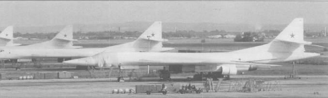 Продолжая рассказ о начальном периоде эксплуатации Ту-160, отметим, что к концу 1987 года 184-й Гв.ТБАП уже получил в общей сложности 10 машин, но в его составе по-прежнему сохранялись бомбардировщики Ту- 22МЗ и постановщики помех Ту-16П. Постепенно «тройки» и «шестнадцатые» передавались другим частям, а часть Ту-16 разобрали и уничтожили согласно Договору о сокращении обычных вооружений в Европе. К моменту распада СССР в двух эскадрильях полка числился 21 самолет, третья эскадрилья имела в своем составе только учебные Ту-134УБЛ, которые использовались для обучения летного состава и поддержания летных навыков экипажей, сохраняя ресурс боевых машин.