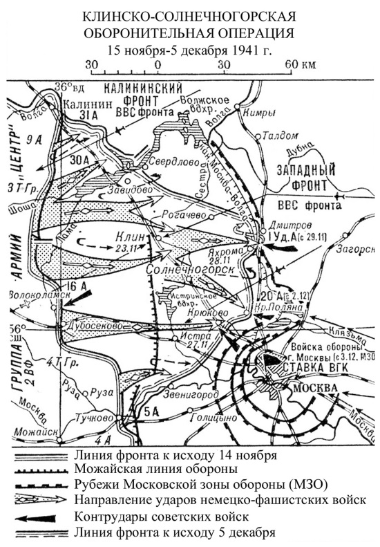 Все происшедшее здесь в конце ноября – начале декабря 1941 г. укладывается военными историками в рамки двух операций, имеющих одинаковое название (Клинско-Солнечногор-ская) и отличающихся тем, что одна из них оборонительная, а другая – наступательная.