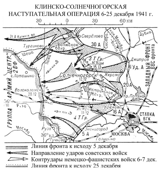 Клинско-Солнечногорская наступательная операция правого крыла Западного фронта, проведенная 6—25 декабря 1941 г., последовала вслед за завершением оборонительных боев без какой-либо оперативной паузы. Это позволило получить определенные преимущества. Немецкие войска в тот момент не успели организовать оборону по всему фронту вклинения и находились в неустойчивом положении. Дата начала наступления довольно условна, так как 20-я А и 1-я УдА начали наносить контрудары еще 1-го декабря и не прекращали боевых действий до 6-го (о чем будет подробнее рассказано далее), а 16-я А начала атаку только 7-го декабря. Цель Клинско-Солнечногорской наступательной операции – разгром 3-й и 4-й танковой групп противника (7 танковых, 3,5 моторизованных и 9 пехотных дивизий) в районе Клин, Истра, Солнечногорск, ликвидация угрозы обхода Москвы с севера, создание благоприятных условий для дальнейшего наступления на запад. К началу операции войска правого крыла (30-я, 1-я Ударная, 20-я, 16-я, 5-я армии) Западного фронта занимали рубеж западнее Свердлова (у Волжского водохранилища), Дмитров, Красная Поляна, р. Нара. Замысел советского командования предусматривал нанесение по противнику ударов по сходящимся направлениям с северо-востока и востока силами 30-й, 1-й Ударной, 20-й и 16-й армий. 5-я армия наступлением своих правофланговых соединений вдоль левого берега р. Москвы должна была обеспечить левый фланг ударной группировки. С войсками Западного фронта взаимодействовали войска левого крыла Калининского фронта. Для поддержки наступления с воздуха выделялись до 75 % авиации фронта, а также авиация резерва ВТК. Противник превосходил советские войска в артиллерии в 1,2, в танках – в 1,5 раза, лишь в людских ресурсах армии правого крыла фронта имели превосходство в 1,6 раза.