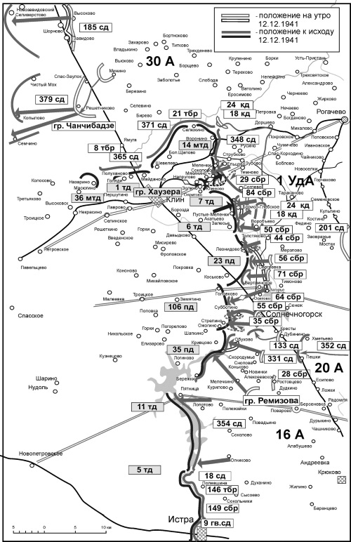 В этот день состав 30-й А претерпел некоторые изменения. 46-я кд вышла из состава армии и Западного фронта и была передана в Калининский. Таким образом, фронт 30-й А несколько укоротился. Теперь он оканчивался возле Волжского водохранилища. Здесь «185 сд к исходу 12.12 овладела районом Ново-Завидовский и вышла на рубеж Селиверстово – Чистый Мох (5 км южнее района Ново-Завидовский); 379 сд вышла на рубеж Копылово – Семчино (18 км северо-западнее г. Клин)»[855].