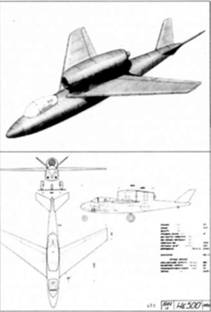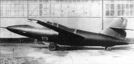 На основе полученных экспериментальных данных немецкий конструктор А. Липшиц в 1944 г. спроектировал истребитель-перехватчик LP-13 с ПВРД. Для изучения особенностей самолета при полете на малых скоростях был в 1945 г. построен безмоторный вариант самолета- DM-1, попавший потом к американцам. Примечательная параллель: восемью годами раньше К. А. Калинин работал над ракетным истребителем К-15, который по своей схеме очень напоминал I.P-13 [5]. Вероятно, это был первый проект реактивного самолета с треугольным крылом малого удлинения. Понятно, что Калинин, как и другие конструкторы, не располагал никакой теоретической п экспериментальной информацией об аэродинамических особенностях такой компоновки при больших скоростях. И это ие единственный пример. В 1942–1944 гг. в СССР ряд интересных проектов реактивных истребителей-перехватчиков был разработан Л. Бартини, А. С. Москалевым и Б. И. Черановским. Однако, реализовать на практике многие преимущества треугольных крыльев оказалось даже сложнее, чем стреловидных: только в 1948 г. в США поднялся в воздух первый реактивный истребитель с треугольным крылом, им стал Конвер XF-92.