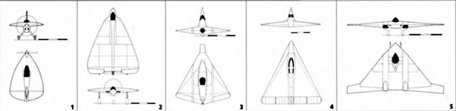 До сих пор речь шла об идеях, предлагавшихся учеными, но это был не единственный путь изысканий новых аэродинамических форм. Мысль использовать крылья малого удлинения треугольной или близкой к ней формы в плане для достижения самолетом больших скоростей принадлежит конструкторам. Наиболее привлекательным для них было малое аэродинамическое сопротивление таких крыльев на небольших углах атаки, соответствующих полету на максимальной скорости. Конечно, конструкторы, разрабатывавшие подобные самолеты, еще не знали ни об эффекте стреловидности, ни о характеристиках устойчивости таких крыльев, ни о величине их волнового сопротивления, возникающего на околозвуковой скорости. Применение треугольных крыльев малого удлинения в проектах скоростных самолетов (почти без исключения бесхвосток) в 30-х- начале 40-х годов носило скорее интуитивный характер. Только во время войны проведенные в Гёттингене эксперименты в сверхзвуковой трубе выявили несомненные достоинства треуголок — небольшое волновое сопротивление, не столь резкие изменения характеристик устойчивости вблизи скорости звука, как на стреловидных и тем более, прямых крыльях.