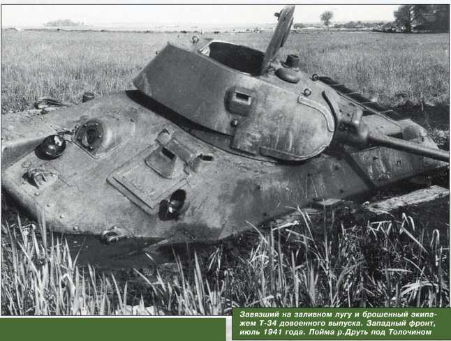Завязший на заливном лугу и брошенный экипажем Т-34 довоенного выпуска. Западный фронт, июль 1941 года. Пойма р. Друть под Толочином.
