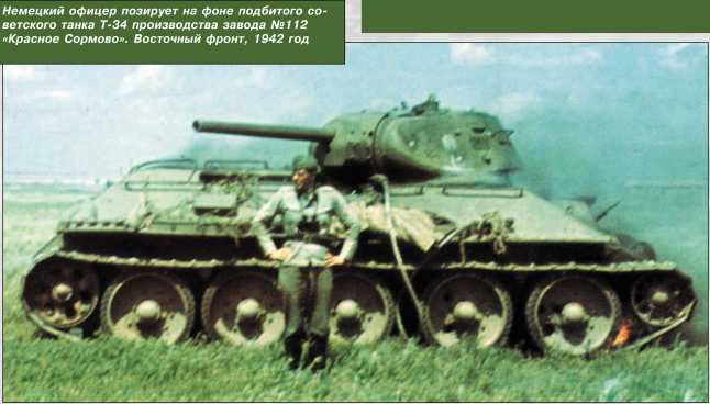 Немецкий офицер позирует на фоне подбитого советского танка Т-34 производства завода № 112 «Красное Сормово». Восточный фронт, 1942 год.