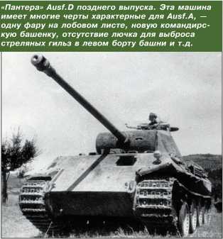 «Пантера» Ausf.D позднего выпуска. Эта машина имеет многие черты характерные для Ausf.A, — одну фару на лобовом листе, новую командирскую башенку, отсутствие лючка для выброса стреляных гильз в левом борту башни и т. д.