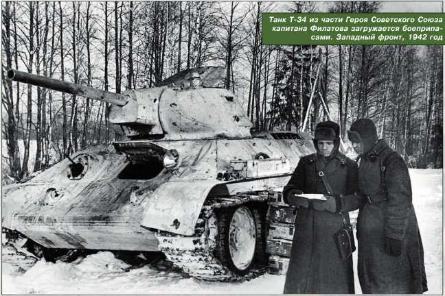 Танк Т-34 из части Героя Советского Союза капитана Филатова загружается боеприпасами. Западный фронт, 1942 год.