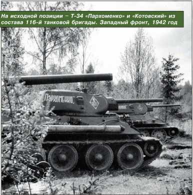 На исходной позиции — Т-34 «Пархоменко» и «Котовский» из состава 116-й танковой бригады. Западный фронт, 1942 год.