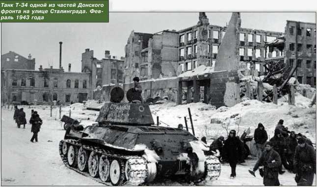 Танк Т-34 одной из частей Донского фронта на улице Сталинграда. Февраль 1943 года.