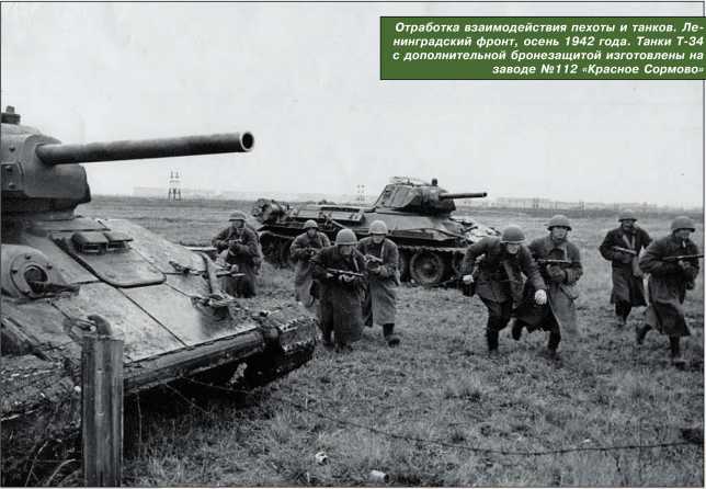 Отработка взаимодействия пехоты и танков. Ленинградский фронт, осень 1942 года. Танки Т-34 с дополнительной бронезащитой изготовлены на заводе № 112 «Красное Сормово».