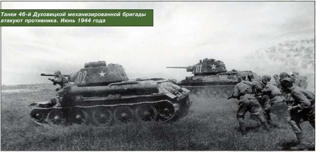 Танки 46-й Духовицкой механизированной бригады атакуют противника. Июнь 1944 года.