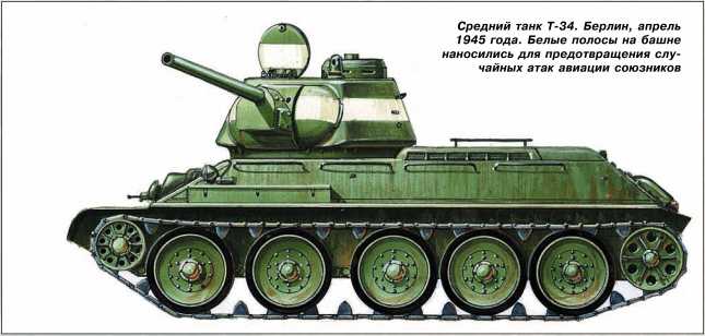 Средний танк Т-34. Берлин, апрель 1945 года. Белые полосы на башне наносились для предотвращения случайных атак авиации союзников.