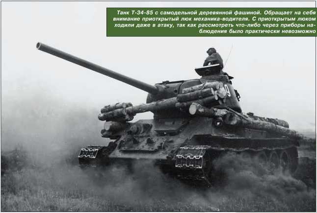 Танк Т-34-85 с самодельной деревянной фашиной. Обращает на себя внимание приоткрытый люк механика-водителя. С приоткрытым люком ходили даже в атаку, так как рассмотреть что-либо через приборы наблюдения было практически невозможно.