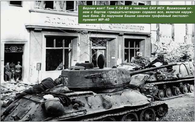 Берлин взят! Танк Т-34-85 и тяжелые САУ ИСУ. Вражеским огнем с бортов «тридцатьчетверки» сорвано все, включая наружные баки. За поручнем башни заначен трофейный пистолет-пулемет МР-40.