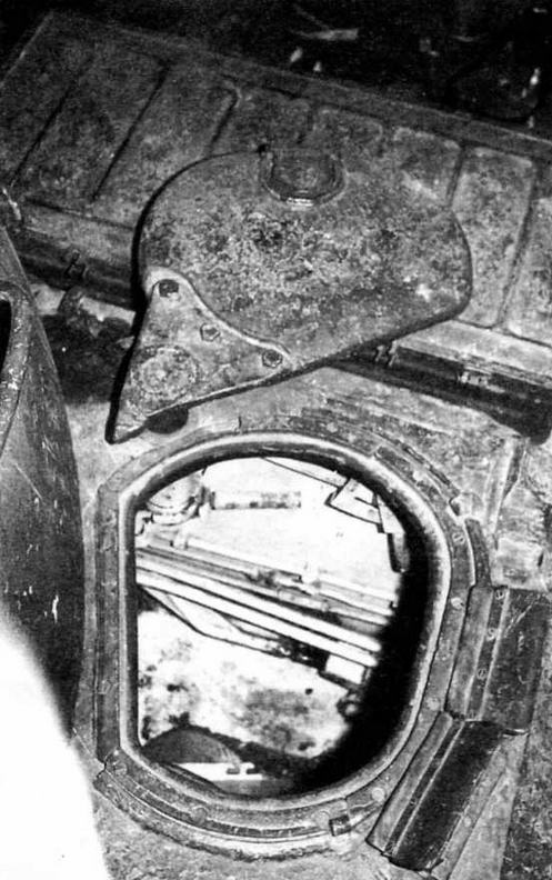 Люк механика-водителя в открытом положении. Крышка сдвинута в сторону. Перед люком установлены призменные приборы наблюдения