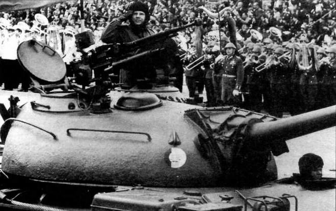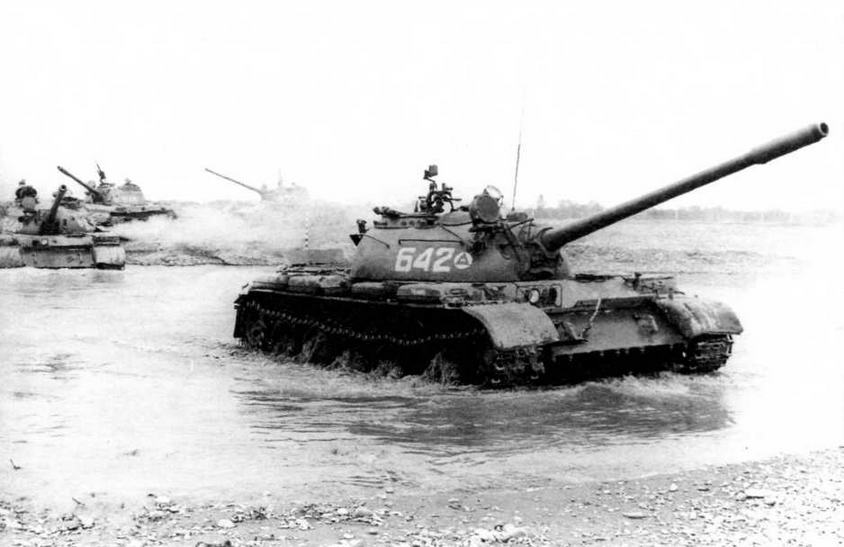 ВООРУЖЕНИЕ. В башне танка установлена 100-мм пушка Д-10ТГ с длиной ствола 56 калибров и спаренный с ней 7,62-мм пулемет СГМТ, стабилизированные в вертикальной плоскости наведения. Масса качающейся части пушки — 1928 кг. Ствол пушки состоит из трубы- моноблока, муфты, казенника, направляющего стержня и эжекционного устройства для очистки канала ствола от пороховых газов после выстрела. Затвор клиновой горизонтальный, с полуавтоматикой механического типа. Противооткатные устройства состоят из гидравлического тормоза отката и гидропневматического накатника. Цилиндры тормоза отката и накатника закреплены в обоймах люльки. Штоки тормоза отката и накатника закреплены в казеннике и при выстреле откатываются вместе со стволом.