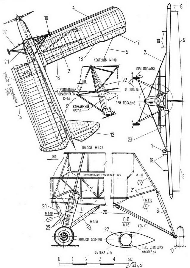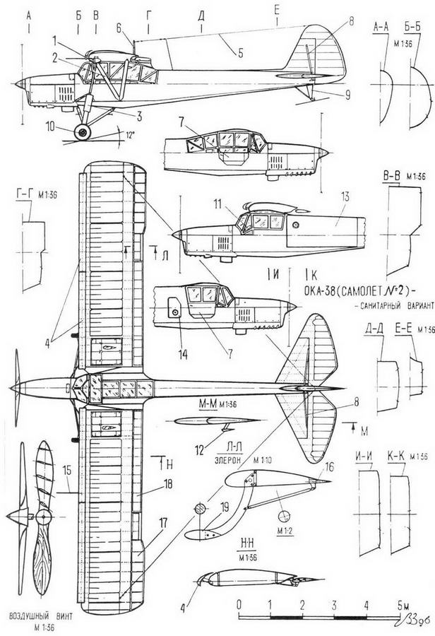 Конструкция ОКА-38 смешанная. Ферменный фюзеляж выполнен зацело с килем из стальных (ЗОХГСА) сваренных между собой труб. Каркас двухлонжеронного крыла и стабилизатора - деревянный. Обшивка везде полотняная, предкрылки - дюралевые. Прямоугольное в плане крыло имеет профиль ЦАГИ Р-IIc [** При исследовании “Шторьха" в СССР обнаружилось, что профиль крыла, элеронов и закрылков тождествен профилю Р-IIс, разработанному П. П. Красилыциковым и описанному в “Трудах ЦАГИ" №103 за 1932 г. (Использовался на планерах Антонова РФ-1, РФ-2 и РФ-3.) Из этого факта советской прессой в свое время была создана целая шпионская история “об украденном фашистами профиле", хотя аэродинамики всего мира считают подобные разработки чем-то вроде интернационального достояния.]. При отклонении щелевого закрылка в посадочное положение (40") элероны автоматически опускались на 15'. Конструкция узлов навески крыла позволяла складывать консоли на стоянке путем поворота их назад вдоль оси фюзеляжа. Стабилизатор переставной с изменяемым в полете углом установки. Для сохранения эффективности рулей высоты при больших отклонениях вверх на их нижней поверхности под небольшим отрицательным углом устанавливались дюралевые подкрылки.