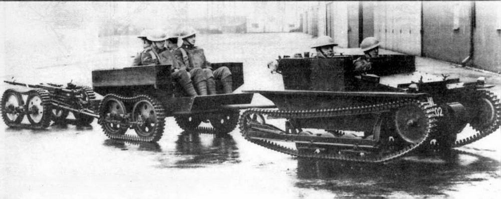 Танкетка «Карден-Лойд» Mk VI, буксирующая прицеп для перевозки пехоты и тяжелый пулемет