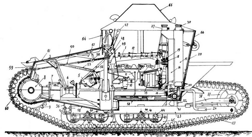 1 — двигатель: 2 — капот; 3 — сиденье механика-водителя: 4 — сиденье стрелка: 5 — коробка передач; б — муфта: 7 — редуктор: 8 — дифференциал: 9 — ведущее колесо: 10 — карбюратор; 11 — впускная труба: 12— выхлопная труба: 13 — магнето; 14 — вентилятор; 15 — радиатор; 16 — шкив; 17 — ремень; 18 — верхний шкив; 19 — установочный эксцентрик; 20 — кронштейн; 21 — поперечная труба; 22 — задний кронштейн; 23 — рама; 24 — пусковая рукоятка; 25 — бензобак; 26 — выхлопной патрубок; 27 — заливная горловина радиатора; 28 — рукоятка пружинного запора задних дверец корпуса; 29 — задняя дверца; 30 — заливная горловина бензобака; 31 — крышка вакуум-бачка; 32—топливный фильтр; 33 — трубка от фильтра к вакуум-бачку; 34 — трубка от вакуум-бачка к впускной трубе; 35 — бензиновый краник; 36 — передний кронштейн; 37 — ленивец; 38 — кронштейн ленивца; 39 — гусеничная цепь; 40 — кронштейны рамы; 41 — оси; 42 — рессор-балансиры; 43 — кронштейны балансиров; 44 — оси катков; 45 — катки; 47 — рычаг ручного тормоза; 48 — сектор рычага; 49 — гайка ручной регулировки тормозов; 50 — тормозные тяги; 51 — кронштейн тормозной тяги; 52 — ось качания рычага направления; 53 — тяги переключения скоростей при нажиме на ножные педали; 54 — тяга нейтрального положения передач; 55 — кронштейн-сектор; 56 — рукоятка тяги к акселератору; 57 — рукоятка тяги к магнето; 58 — днище корпуса; 59 — нижний лобовой лист; 60 — кожух картера дифференциала; 61 — верхний лобовой лист; 62 — передний люк; 64 — лобовой лист боевого отделения; 65 — колпак; 66 — кормовой лист; 68—рама буксирного прибора; 69 — буксирный прибор; 70 — передняя буксирная серьга; 71 — ящики для боеприпасов; 72 — крылья; 73 — фары; 74 — пулеметный станок; 75 — глушитель; 76 — инструментальный ящик