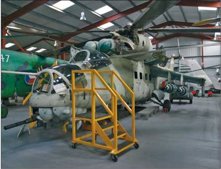 Прежде чем попасть в наш музей, Ми-24 служил в немецкой армейской авиации. В 1992 году эскадрилья, укомплектованная советскими боевыми вертолетами, была расформирована как не соответствующая требованиям, предъявляемым администрацией ФРГ, и машину отправили в боевой резерв. Вертолет Ми-24 принадлежал частям, расквартированным на севере Германии, поэтому его доставка в Англию была сопряжена с некоторыми сложностями. Машину необходимо было разобрать и подготовить к транспортировке. На работу с документами и чертежами ушло несколько месяцев. Наконец вся подготовка была завершена, дата назначена и сообщена представителям компании Bristol Helicopters, которая должна была обеспечить доставку машины на место ее новой «службы». В феврале 1995 года я, как руководитель бригады реставраторов вертолета, отправился в Германию на военную базу, расположенную в глухом лесу. Вертолет (один из двадцати Ми-24, которые были на базе) перебазировали в крытый утепленный ангар для проведения работ по подготовке его к путешествию, которые заняли три дня.