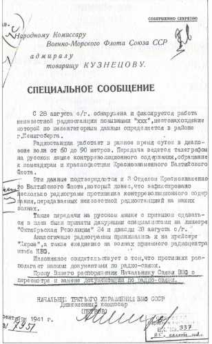 Спецсообщение 3-го Управления ВМФ СССР о работе неизвестной радиостанции в районе Кёнигсберга.