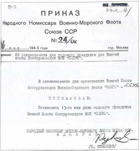 Приказ наркома ВМФ СССР об установлении дня годового праздника Высшей школы контрразведки НК ВМФ. 26 мая 1944 г.
