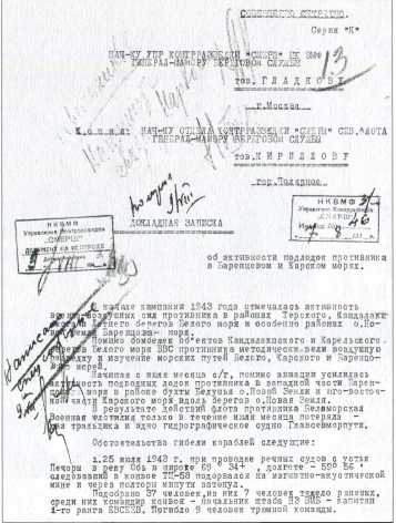На основе изучения имевшихся оперативных материалов 15 октября 1943 г. Отдел контрразведки «Смерш» СФ подготовил аналитический документ, в котором было выдвинуто предположение о том, что противник имеет достаточно разведывательных данных (как ледовых, так и войсковых) по западному сектору Арктики. По мнению советских контрразведчиков, противнику в этом также помогло появление в открытой печати (газета «Известия» № 129/7815 от 04.06.1942 г.) данных о подготовке советских действий в Арктике, ряд корреспонденций в одной из радиопередач из г. Архангельска, а также открытые переговоры судов ГУСМП как между собой, так и полярными станциями. Кроме того, в ходе расследований обстоятельств гибели советских и союзных конвоев контрразведчики установили, что «немцы точно знали, по какому фарватеру пойдут корабли, несмотря на то, что шли по этому фарватеру впервые»[401].