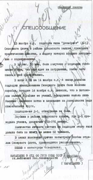 Спецсообщение ОО ГУГБ НКВД СССР о гибели подлодки Д-1.