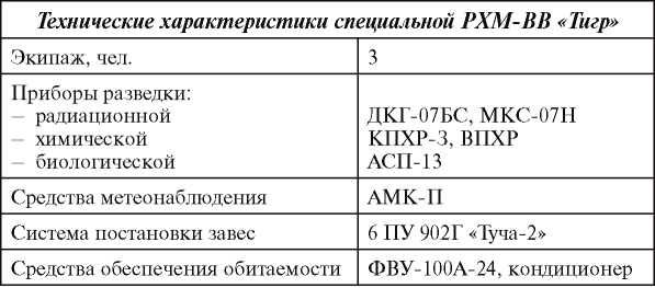 Специальная машина радиационной, химической, биологической разведки РХМ-ВВ «Тигр» предназначена для ведения радиационной, химической, неспецифической биологической разведки и наблюдения, оперативного дозиметрического контроля радиационной обстановки, обнаружения загрязнения радиоактивными веществами различных поверхностей, обнаружения паров и аэрозолей отравляющих и других токсичных химических веществ в воздухе, химического заражения местности, оперативного экспресс-контроля биологической безопасности объектов внешней среды (атмосферного воздуха), защиты экипажа от поражающих факторов оружия массового поражения. Без каких-либо ограничений РХМ-ВВ «Тигр» сохраняет работоспособность при температуре окружающего воздуха от -40° до+40 °C.