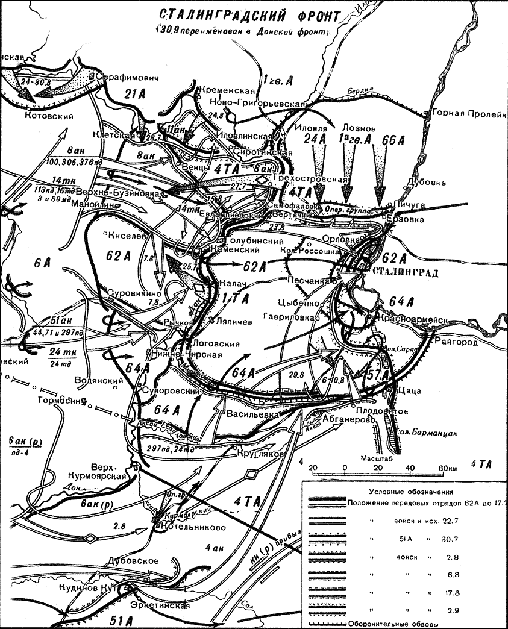 В маневренный период операции были достаточно результативно использованы формировавшиеся на ходу 1 -я и 4-я танковые армии. В ходе позиционных боев решение поставленной задачи шло по двум направлениям. Во-первых, был принят ряд мер по обеспечению 62-й армии пополнениями, боеприпасами и продовольствием. Во-вторых (и это в значительной степени определило успех оборонительной операции в целом), был организован нажим на стоящую у стен Сталинграда группировку противника с севера. В целом можно сказать, что Сталинградская оборонительная операция — это один из примеров удержания почти полностью изолированного гарнизона внешним воздействием на осаждающего. Первый пример — это Ленинград за весь период блокады (многочисленные наступления Волховского фронта), второй — начальная фаза борьбы за Севастополь в декабре 1941 г. — мае 1942 г. (высадка десанта и борьба на Керченском полуострове) и третий — 62-я армия в боях за Сталинград в конце августа — начале ноября 1942 г. (действия Сталинградского и Донского фронтов). Нажим на северный фланг армии Паулюса был настолько плотным, что штурмовала СТЗ в октябре 1942 г. 14-я танковая дивизия, а не 16-я танковая дивизия, вышедшая к его стенам еще 23 августа.
