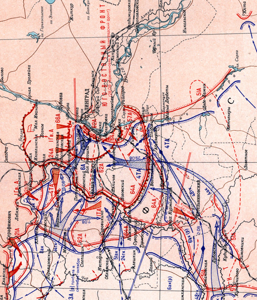 Сталинград, как и Курск, является одним из жупелов сторонников пассивной стратегии. Находившаяся на голодном пайке в плане обеспечения пополнением, боеприпасами и продовольствием 62-я армия имела весьма скромные оборонительные возможности. В случае пассивности окружающих Сталинград советских войск она бы повторила судьбу Приморской армии в Севастополе в июне 1942 г. Обороняться с Волгой за спиной в развалинах города против нормально снабжаемой армии, у которой развязаны руки, можно, но недолго. Разворот на Сталинград VIII и XIV корпусов привел бы к выковыриванию защитников из остатков жилых домов и заводов и сбрасыванию их в Волгу.