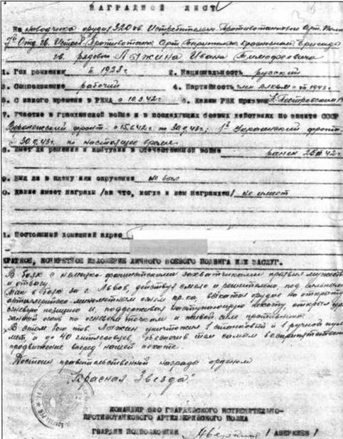 Наградной лист Ивана Тимофеевича Лыжина на медаль "За Отвагу"