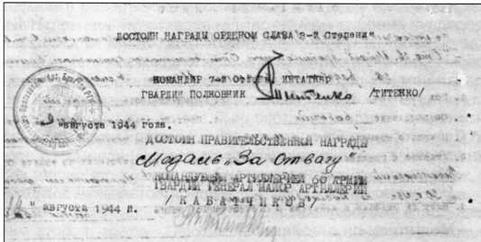 В сентябре 1943-го бригаде присвоили гвардейское звание, и она стала именоваться 7-я отдельная гвардейская истребительно-противотанковая артиллерийская бригада Резерва Главного Командования. За время войны нам присвоили почетное наименование "Тернопольская" и наградили орденами Ленина, Красного Знамени, Богдана Хмельницкого, Суворова и Кутузова. Наш полк стал именоваться 320-м гвардейским истребительно-противотанковым артиллерийским полком.