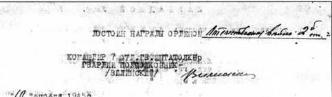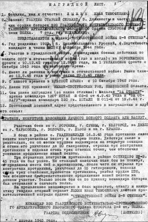 Наградной лист Ивана Тимофеевича Лыжина на орден Славы 3-й степени.