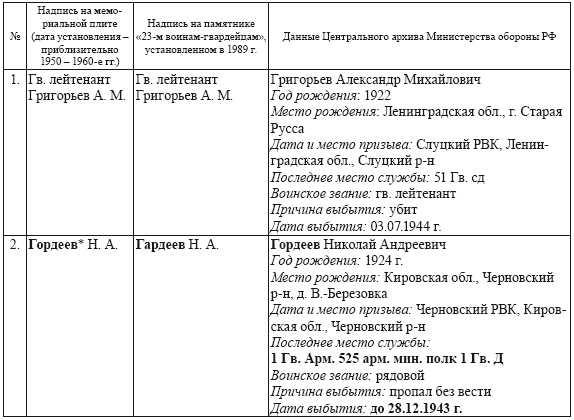 Соотношение информации о гвардейцах 51 гв. стрелковой дивизии 158-го гв. стрелкового полка, находящейся на памятнике «23-м воинам-гвардейцам», и данных Центрального архива Министерства обороны РФ[15]